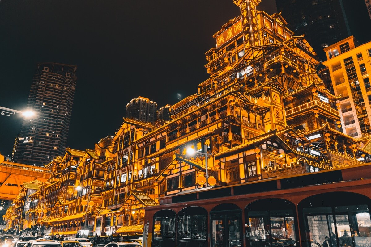 Embark on a scenic morning transfer from Chengdu to Chongqing (environ. 5 heures). After lunch, dive into Chongqing’s famed vertical urban landscape, exploring the historic alleyways of Shibati (Eighteen Steps), marveling at the mind-bending stacked architecture of Guixinglou which seemingly defies gravity, and visiting the central landmark, le Liberation Monument. As evening falls, explore the dazzling Hongya Cave with its neon lights and riverside charm, then choose to cap off your day with an optional 40‑minute Yangtze River night cruise, offering spectacular views of Chongqing’s glittering skyline.